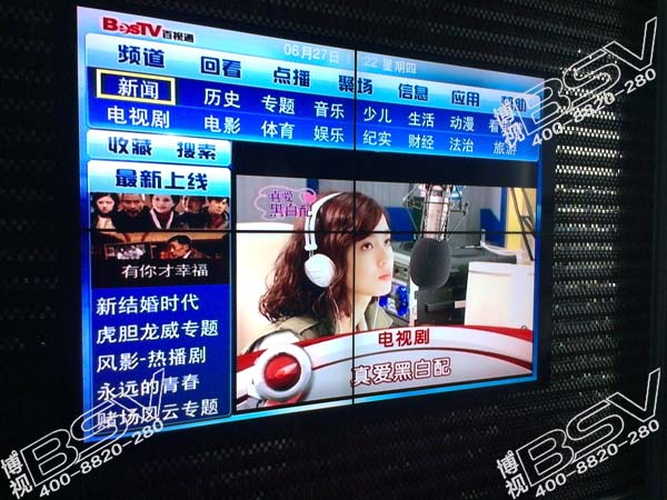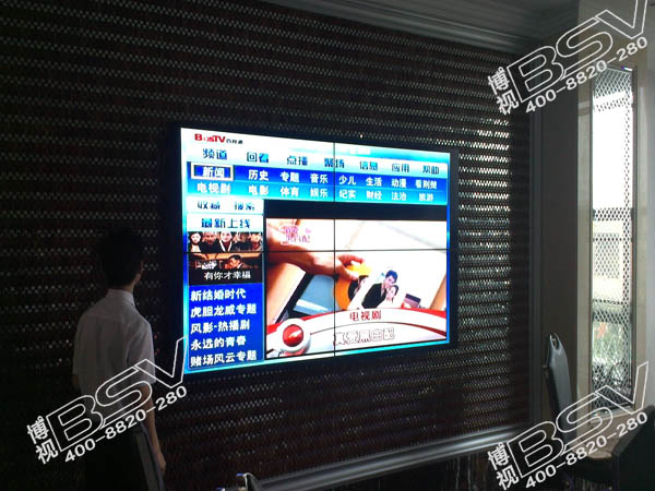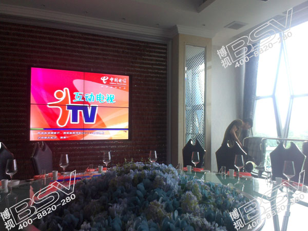 拼接方式:采用武漢博視同創(chuàng)46寸超窄邊拼接屏,2行2列拼接方案,液晶拼接適用了各類視頻播放,流暢度高,利用高清解碼器,播放視頻圖像清晰,色彩鮮艷,擁有良好視角,可為酒店顯示設備增色不少。
